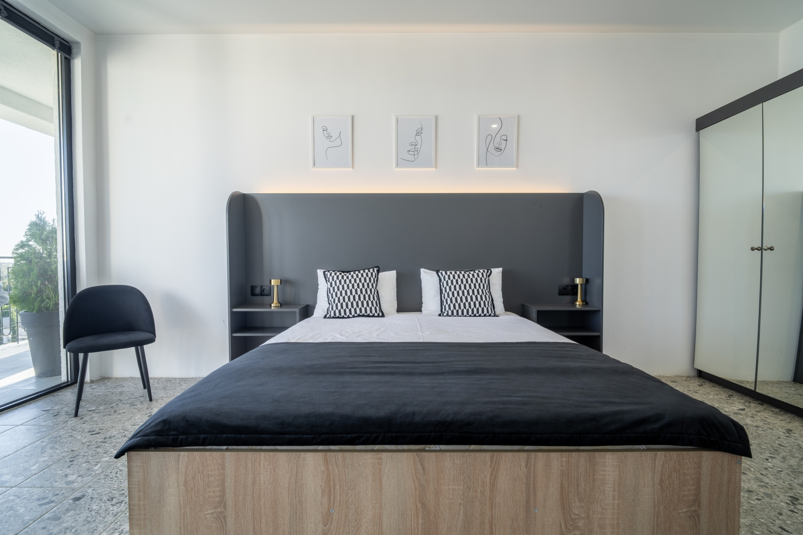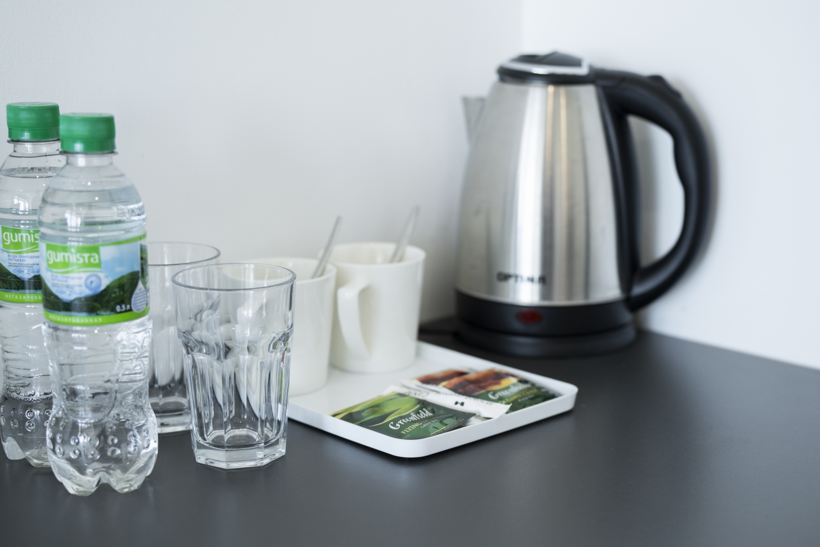 Стандарт без балкона 2 корпус - двухместный однокомнатный номер без балкона с двуспальной кроватью. Номера данной категории расположены на 1 этаже 2 корпуса. В номере: двуспальная кровать, панорамные окна, 2 тумбы, мини-холодильник, рабочий стол и стул, кондиционер, набор для приготовления чая и кофе, бутилированная вода, шкаф для одежды, вешалки, ТВ. В ванной комнате: душ, санузел, раковина, зеркало, банные полотенца, халат и тапочки, гигиенические принадлежности, фен. Размещение (макс.количество человек) – 2 основных места + 1 ребенок до 5 лет без места (спит с родителями).